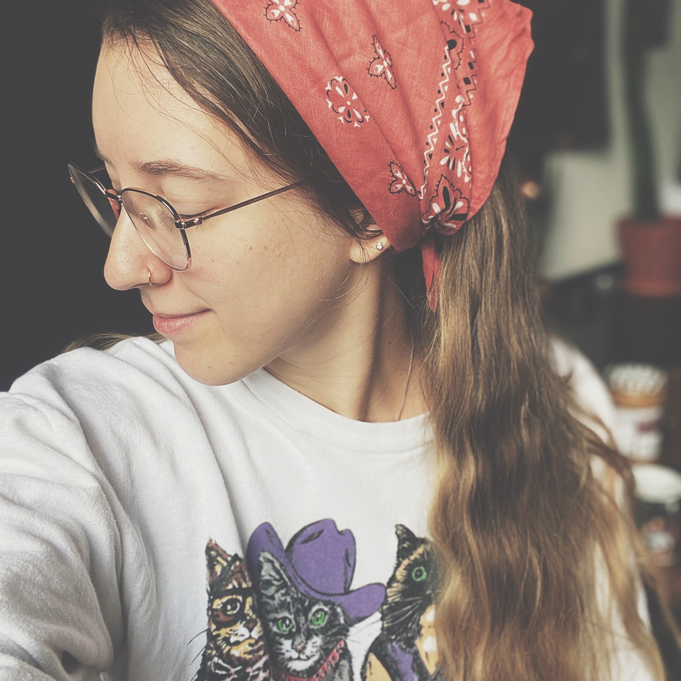 I am a huge fan of messy buns so typically, I put my head upside down and wrap my hair circularly using one hand to hold the hair in place and the other to wrap. Place hair tie around balled hair and fold bandana in half, to a triangle. Roll up your bandana "cigar" style - as skinny of a "cigar" as you can make it and wrap around bun twice. Single or double knot to end.